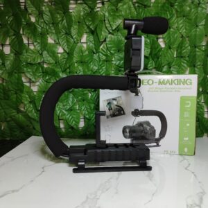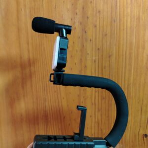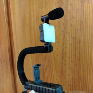 Incluye un mango ergonómico para un agarre cómodo, una montura para el dispositivo de grabación (cámara o smartphone), y a menudo accesorios como un micrófono (como se ve en la imagen) o una luz LED.